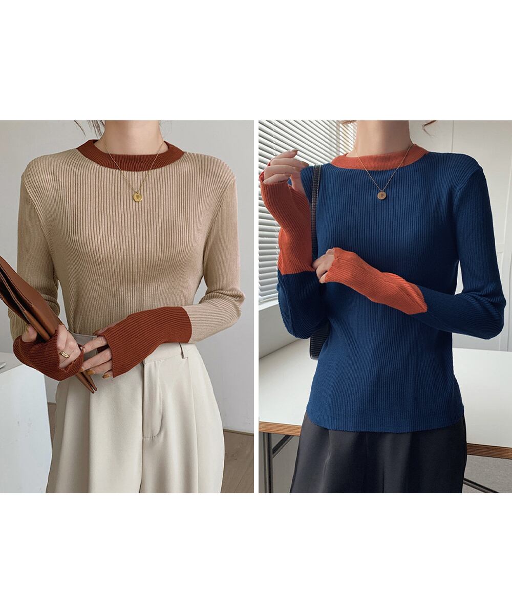 韓国風 リブニットトップス 秋冬配色ニットセーター 大人可愛い 長袖ニットソー キレイめカジュアル ニットインナーお洒落